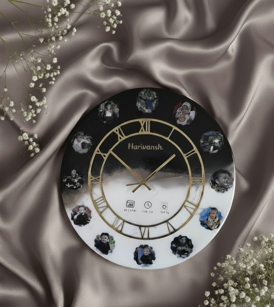 Handcrafted with premium resin, this clock beautifully displays twelve cute monthly photos of your baby — showcasing their growth, expressions, and precious moments.
