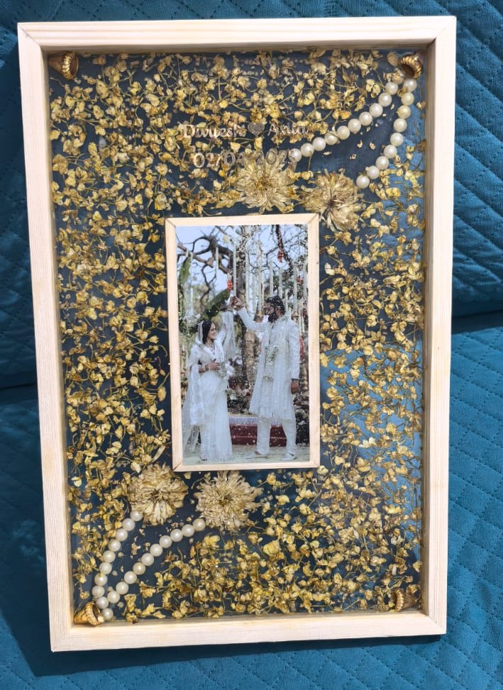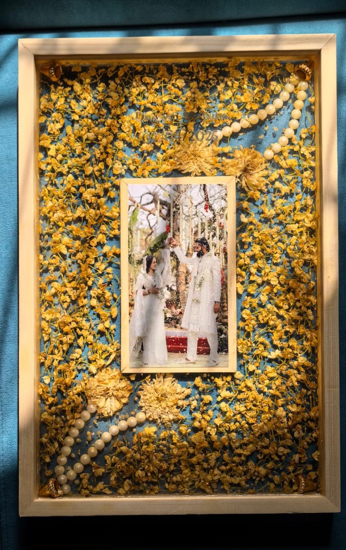 Handcrafted with love, this frame preserves your wedding varmala flowers, adding your favorite photo to create a stunning keepsake that tells your love story.
