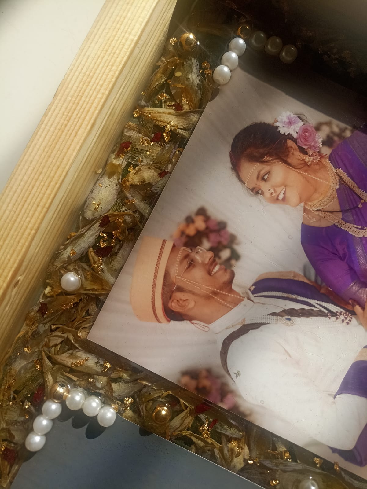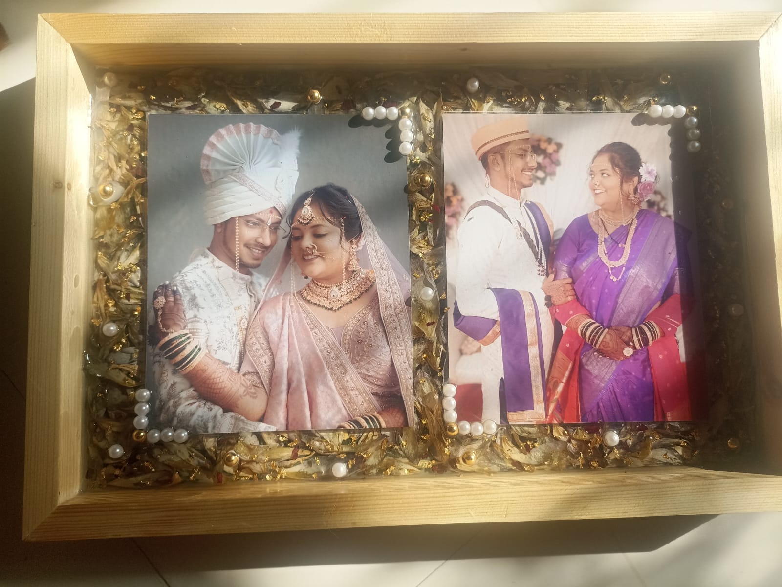 Crafted using premium-quality resin and a durable wooden frame, this piece ensures long-lasting clarity and elegance. The combination of floral beauty and personal memories creates a meaningful décor element — perfect for couples who want to cherish their special day forever.