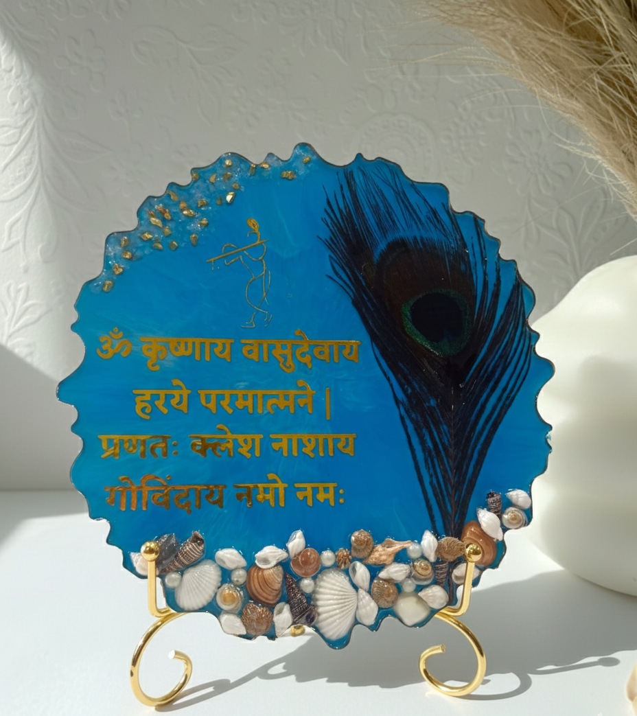 Designed with a vibrant blue base, a real peacock feather, gold detailing, and sacred Krishna mantra inscribed beautifully β this piece radiates spiritual charm and serenity. Decorated with natural seashells and pearls, it captures the essence of devotion and artistry in one stunning keepsake.