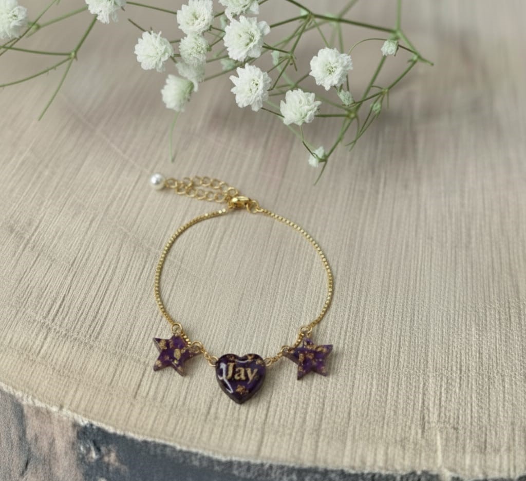The bracelet features a heart-shaped resin charm in the center with your name beautifully embedded inside, along with two tiny star charms crafted from resin — symbolizing love, dreams & togetherness ✨⭐
