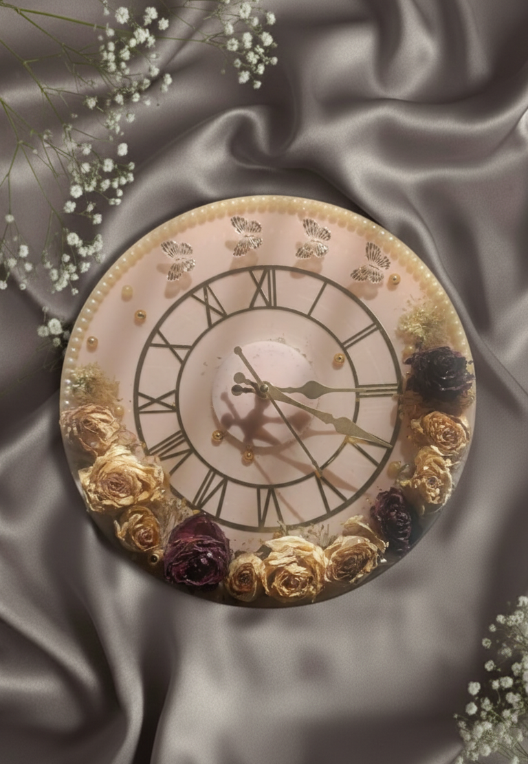 Handmade with real dried roses embedded in premium resin, this clock blends vintage charm with artistic craftsmanship.