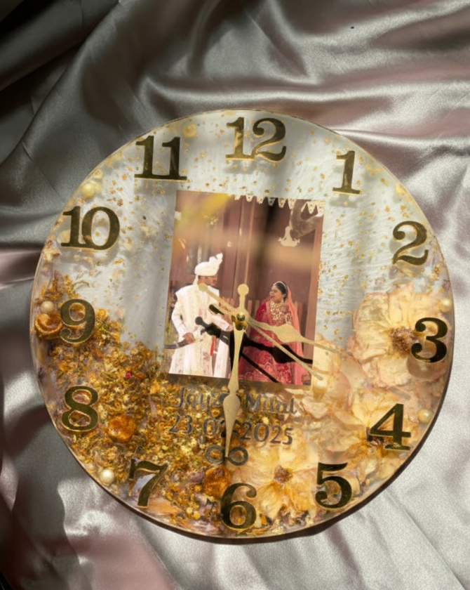 Each clock is handcrafted with real varmala flowers, gold flakes, and your favorite wedding photo — symbolizing eternal love frozen beautifully in time.